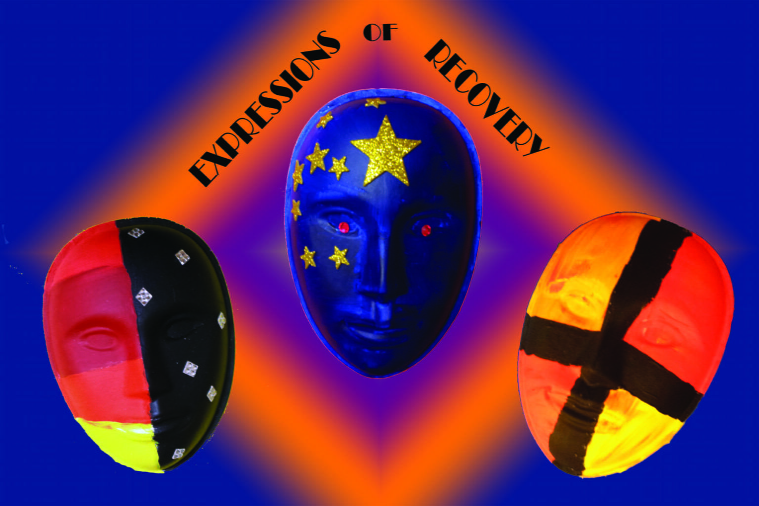 This series of masks represents my lifelong struggle with mental illness. The dark blue and black colors are a representation of the depression that I deal with. The reds and yellows show the happiness that my recovery has enabled me to feel. The stars and the crystals show the periods of pure joy that I now have in my life.