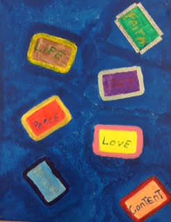 The deep blue background of this piece represents the dark sea of depression that I often swim in. Through the process of my recovery I have learned to focus on my positive thoughts and emotions. I cling to these like life preservers when I am awash in bad times and they help keep me afloat until things get better.