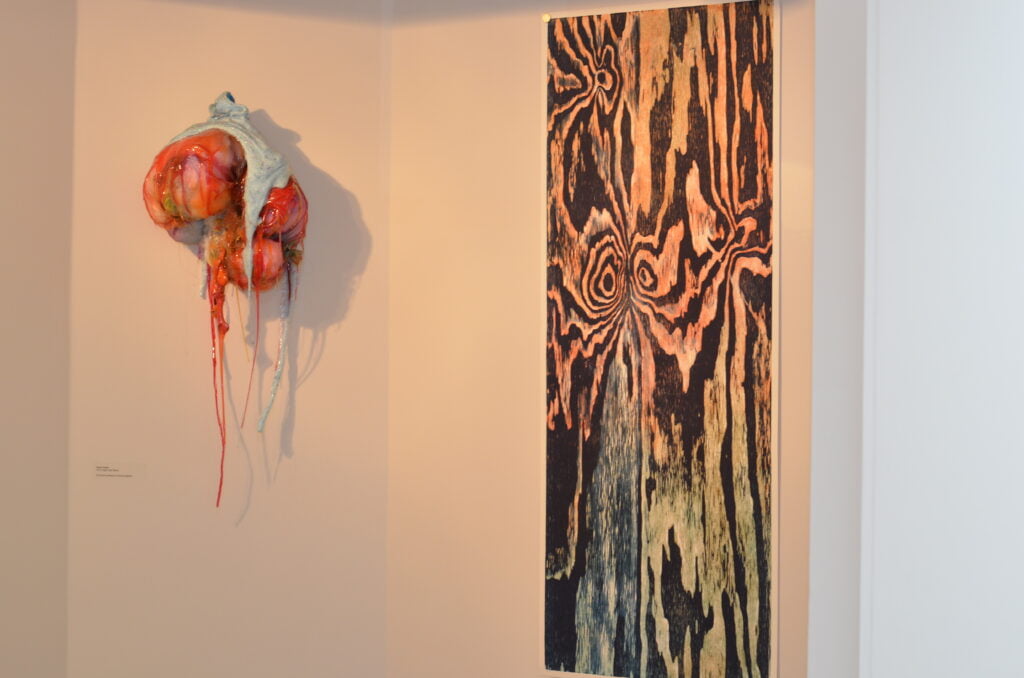 Pam Testa works to explore the patterns found in nature, and particularly, in this piece, woodgrain. She carefully chooses wood with intriguing grain patterns where she can see something hidden, such as a landscape, or in this case, an owl. She reveals her vision by cutting away parts of the grain and selectively inking the block during the printing process.