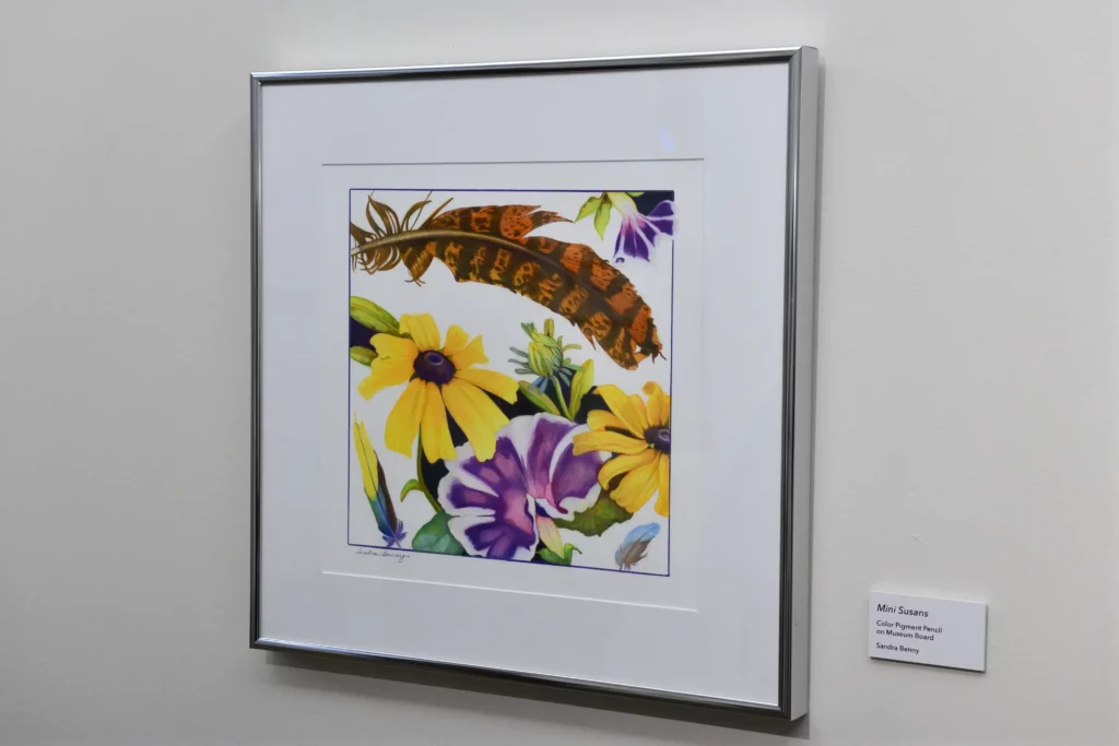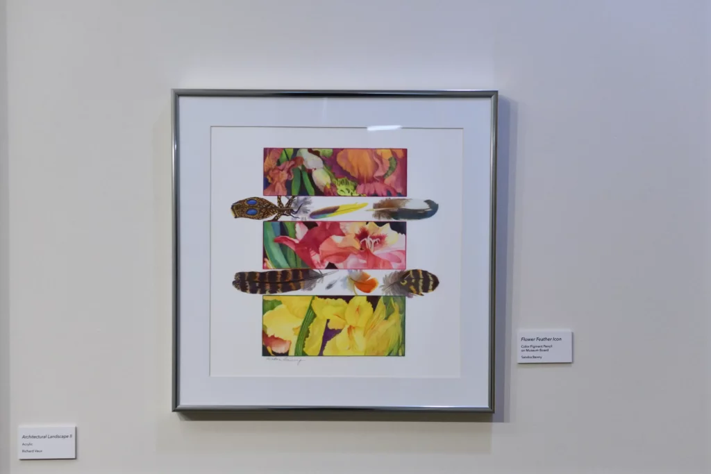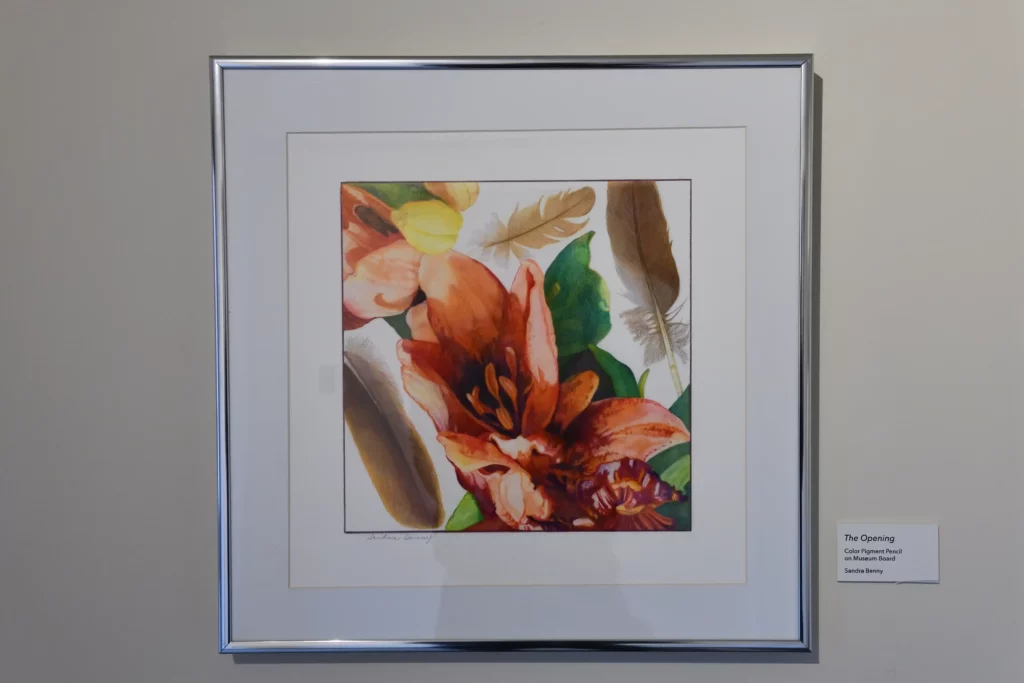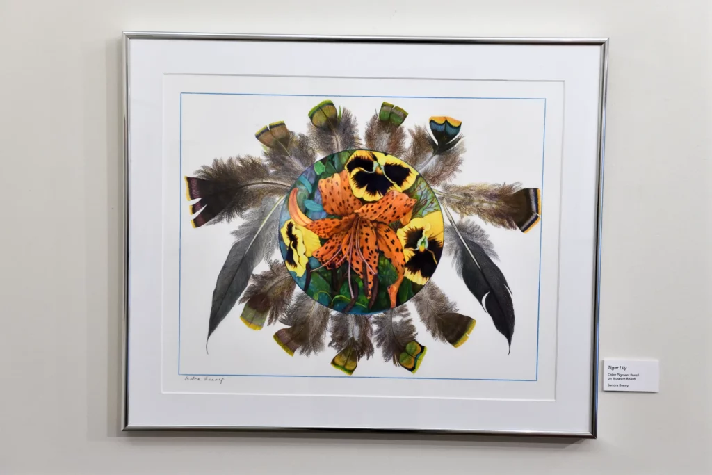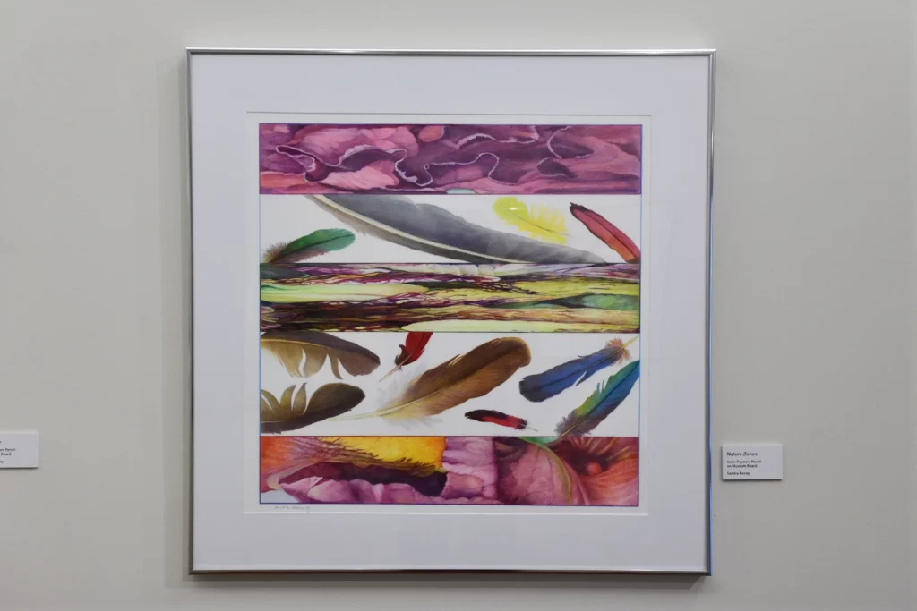 Sandra Benny says nature has always been the greatest inspiration for her drawings. The majestic color combinations and designs found in feathers, flowers, sunsets, clouds, and other phenomena of the natural world create a treasure trove of possible compositions. Individual feathers are very intriguing to her. The colors and patterns on each feather are unique. Flaws, acquired in daily life, add character. Centers of flowers are often composed of patterns that become focal points of her work. She likes to emphasize the unobtrusive parts in nature and believes that we are stewards of this earth and only temporary visitors. She says “my work is the diary of my life.”