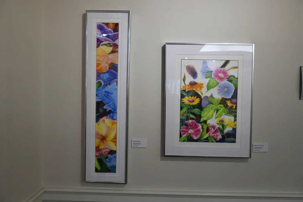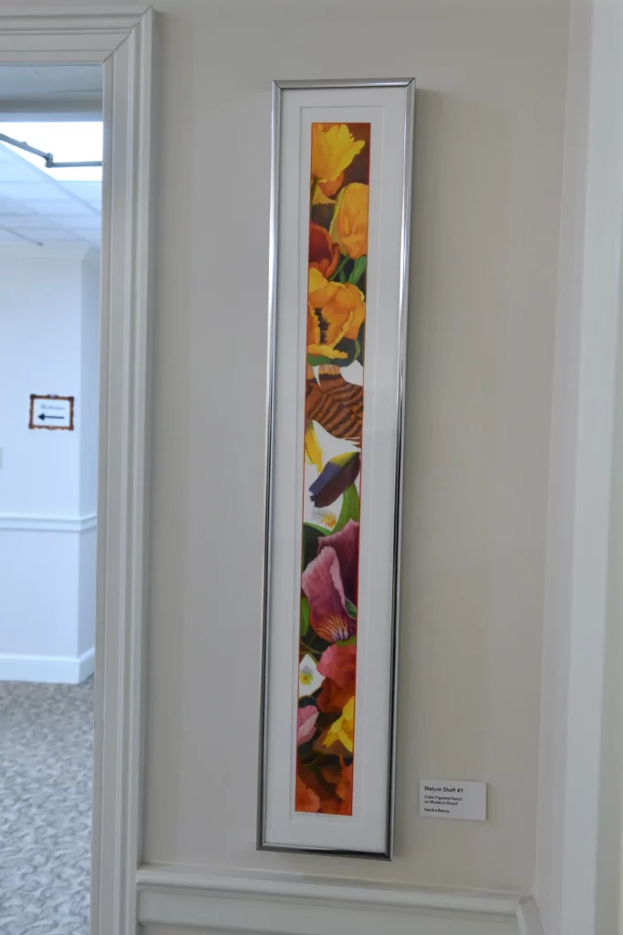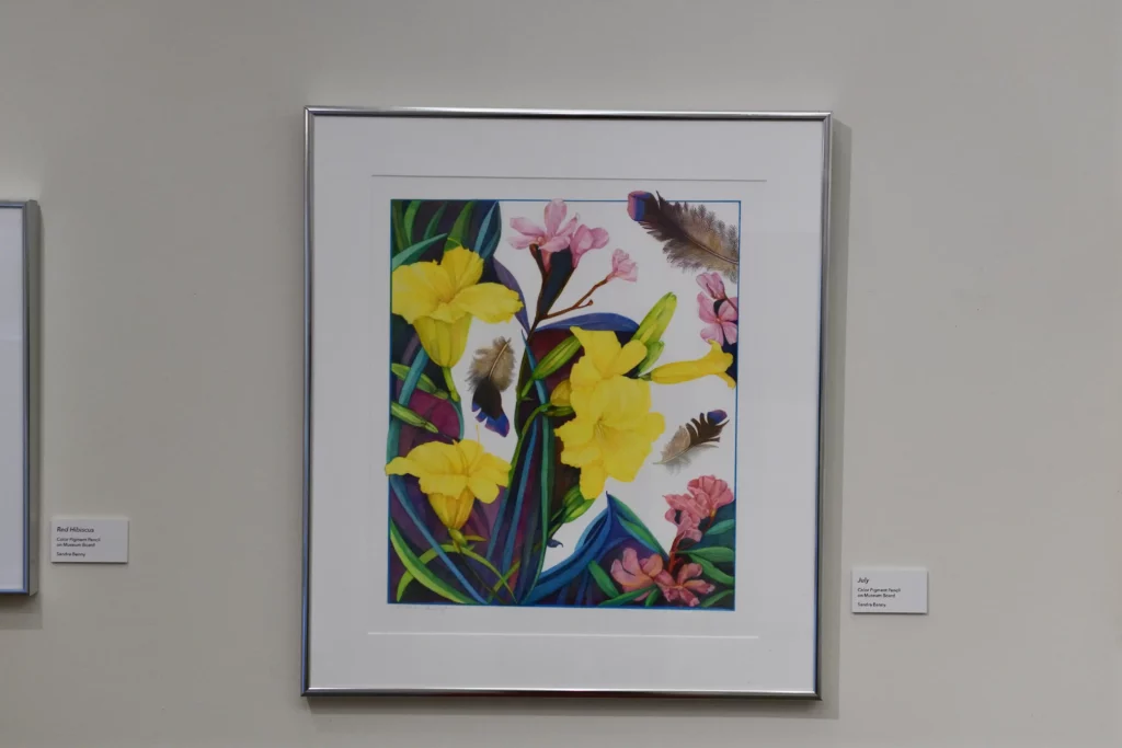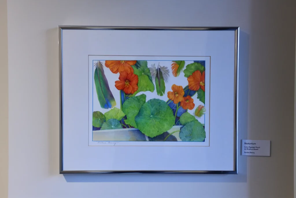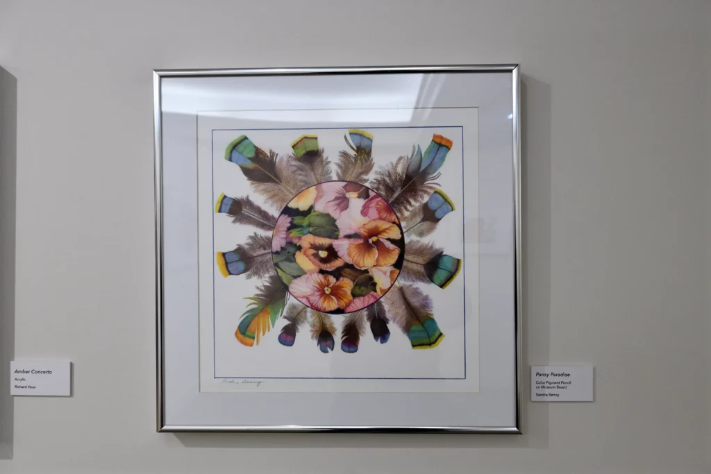 Sandra Benny says nature has always been the greatest inspiration for her drawings. The majestic color combinations and designs found in feathers, flowers, sunsets, clouds, and other phenomena of the natural world create a treasure trove of possible compositions. Individual feathers are very intriguing to her. The colors and patterns on each feather are unique. Flaws, acquired in daily life, add character. Centers of flowers are often composed of patterns that become focal points of her work. She likes to emphasize the unobtrusive parts in nature and believes that we are stewards of this earth and only temporary visitors. She says “my work is the diary of my life.”