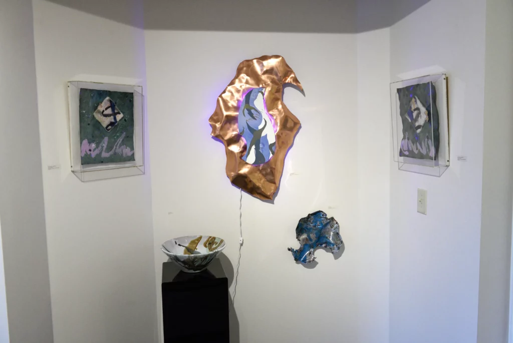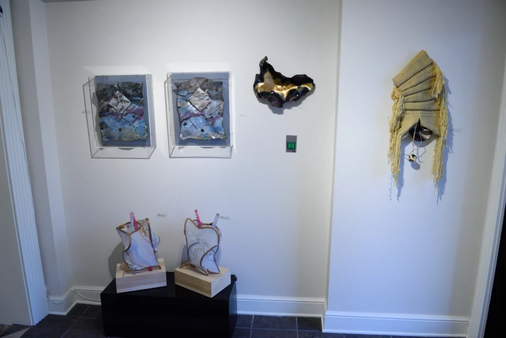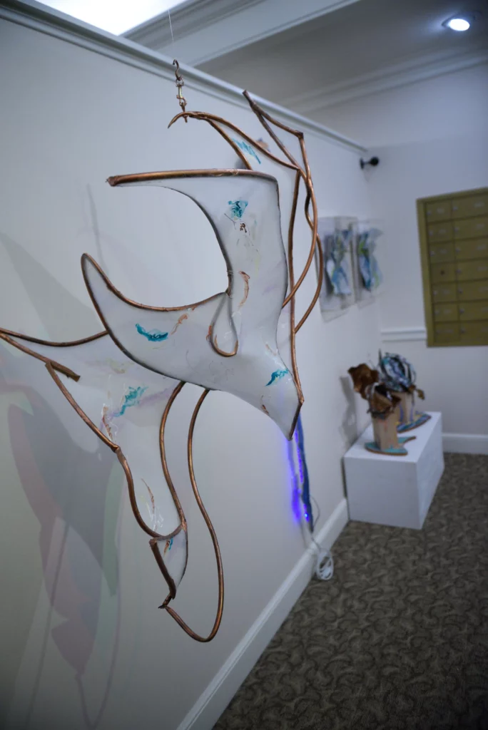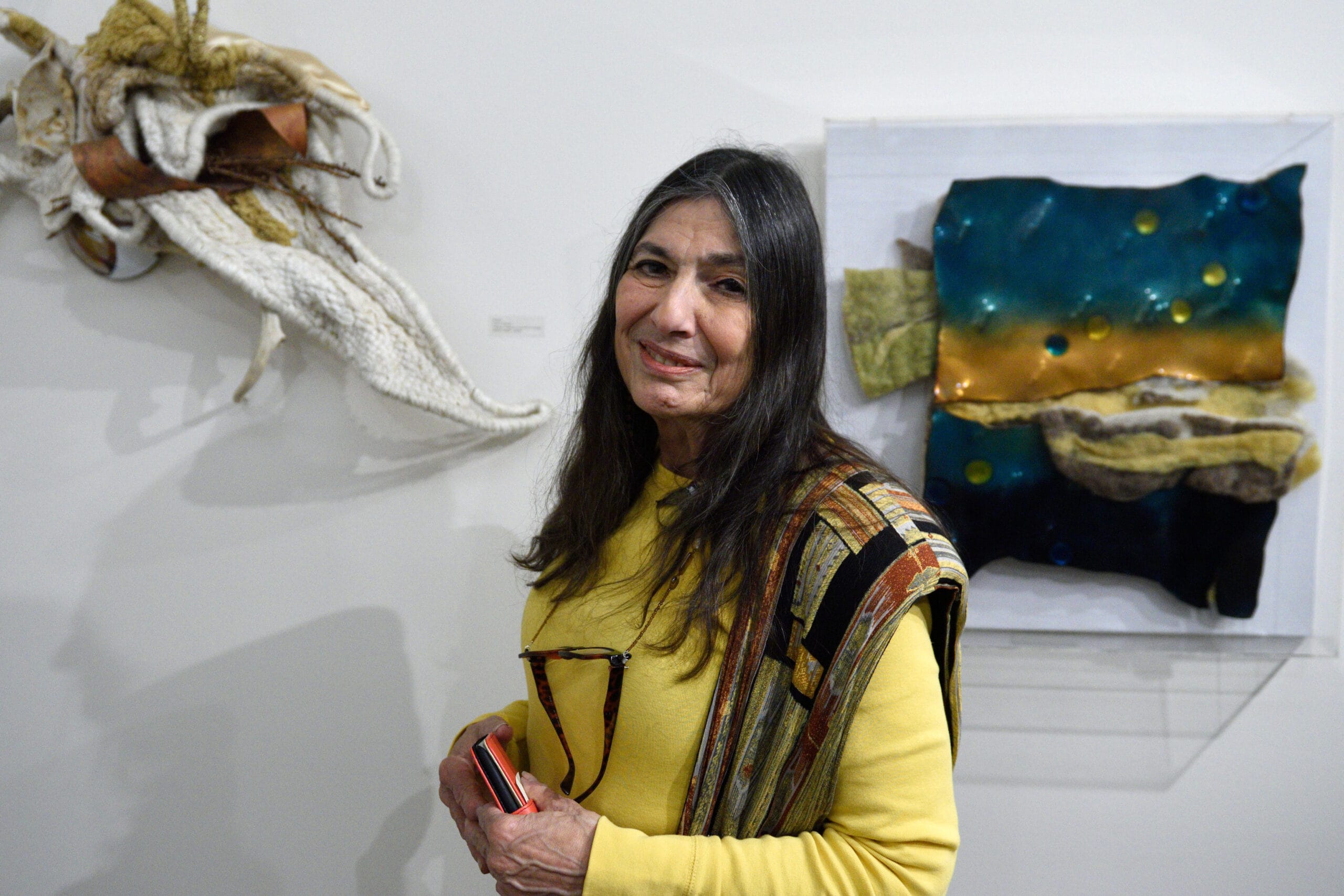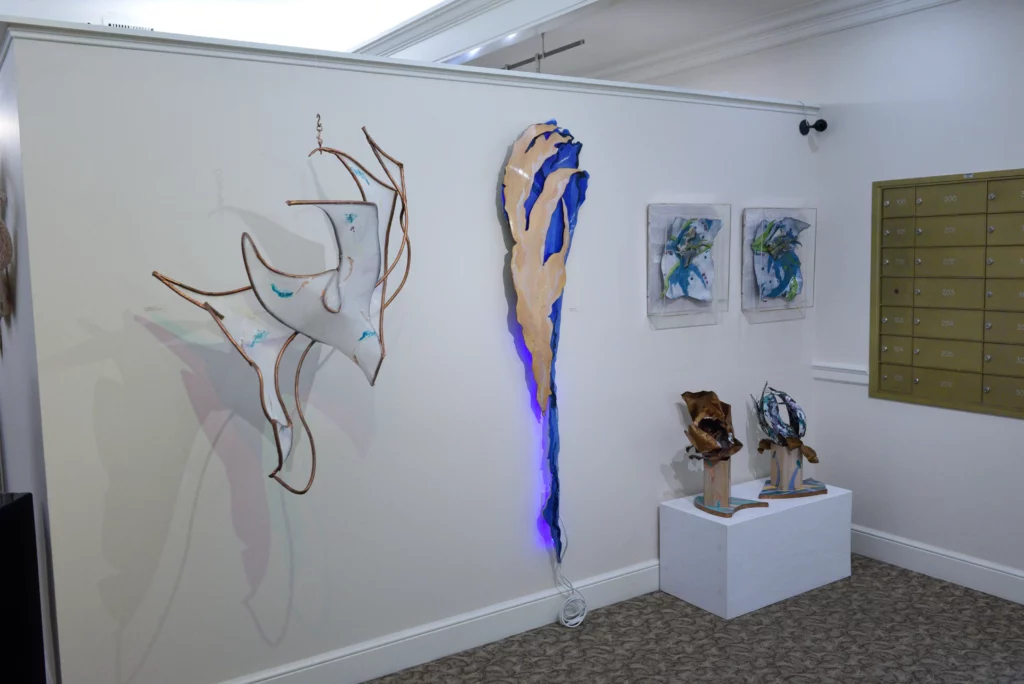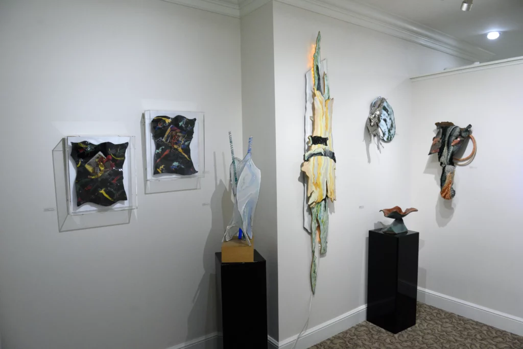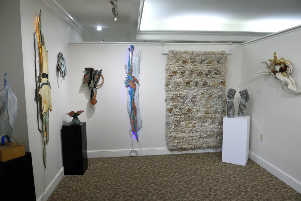 Carol’s work is always organic, textured and dimensional. It speaks to the beauty of the world and the magic of complex shapes and materials. She is somewhat eclectic and works in a number of different series simultaneously and considers any media to be painting or sculpture and uses it accordingly. Over time, she moved from highly textured painting to fiber, enamel, and light as her most prevalent media, with the incorporation of many other media. Her larger work is installations where the viewer is inside the work. She thinks of these smaller works as sketches for the larger. For many years Carol was the designer for a laser light company where the lines could reach out across acres. To her, it is all highly environmental.