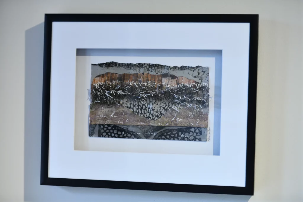 Also, I have come to consider that the botanical world has a message for us. There is more to life than meets the eye! Over several years, I tried many different artistic approaches and finally discovered my voice in the mixed media collage process. I actually devised my own process of 3-D paper collage, also considered as a low relief sculpture. I use acrylic paints, mediums, inks, mono-printing and the metal gilding process in my work. I also include asemic writing and numbers in many of my works as a means of giving voice to the botanical world. Recently, I have begun to use my process to create free standing paper assemblages.