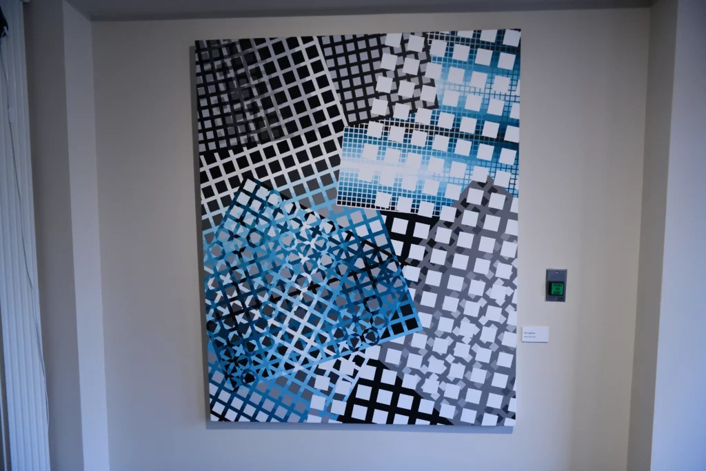 At present, in addition to the “Op” artists, my influences now include Frank Stella (specifically the “plane” paintings of the early to mid-1970’s) and Liubov Popova of the “Constructivist” movement. As such, my artworks have evolved into presentations of various grid comparisons, such as grids of different sizes, angles, and colors. The color progressions are now being used to present the contrasting gridworks creating a dense and ambiguous space.