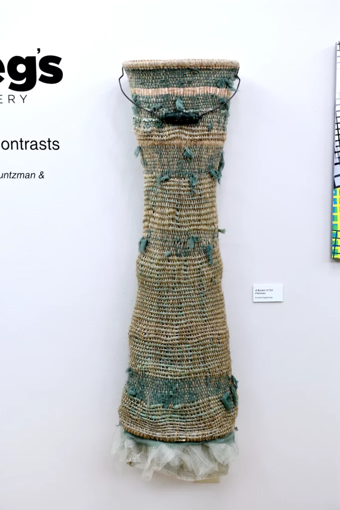 Some of the clothing sculpture is about the process of making. Slowly twining or weaving a form out of nothing but ‘string’ also speaks about how we develop and change in increments. Staining, distressing outdoors, dyeing, and felting are all processes that inform as well as create.