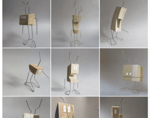 Flame worked borosilicate glass, painted wood