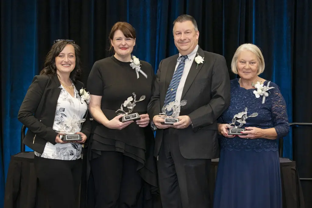 The award sculpture, handcrafted at the Fräbel Glass Art Studio in Atlanta, Georgia, represents Peg’s favorite flower, the American Dogwood. Each piece is individually created, making every sculpture a distinctive work of glass art—one of a kind, just like the work it honors.